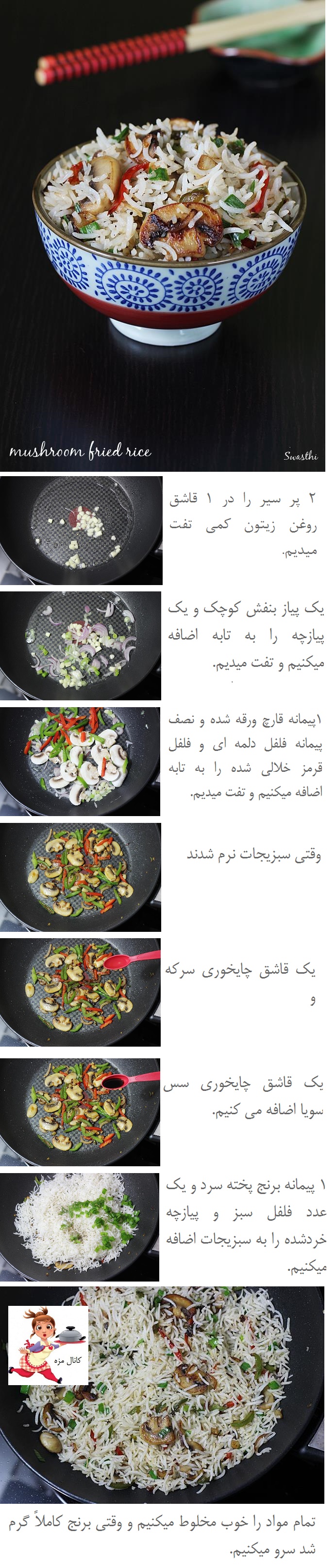 بعد با چنگال دانه های برنج رو از هم جدا می کنیم و سرو می کنیم.