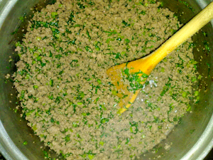 پیاز را سرخ کرده گوشت را در آن سرخ می کنیم و ادویه میزنیم کرفس یا جعفری را اضافه می کنیم و خوب سرخ می کنیم.