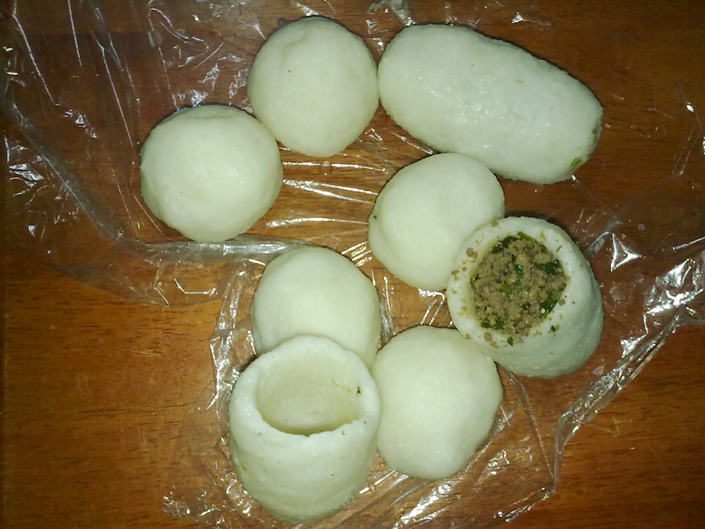 خمیر برنج را به صورت گلوله هایی در میاریم داخل هر گلوله رو با انگشت گود می کنیم از مخلوط گوشت می ریزیم و سر کبه ها رو می بندیم.