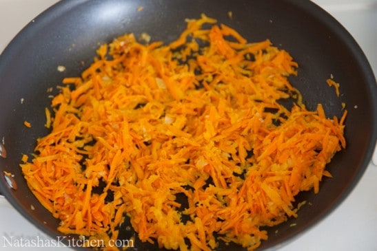 در تابه بزرگی ۲ قاشق روغن زیتون ریخته پیاز رو در اون سرخ می کنیم و کمی بعد هویج رو اضافه می کنیم: